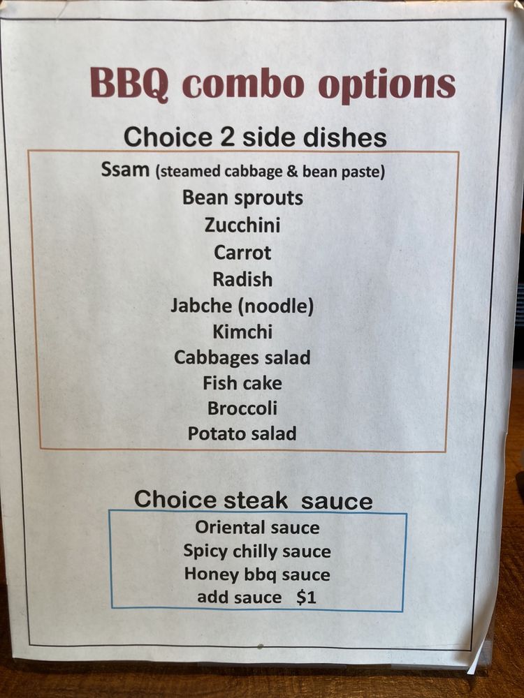 BBQ meat with rice and 2 side dishes. And can choice special steak sauces. The meat is so much juicy and tender. Dipping with your favorite sauce then more delicious.